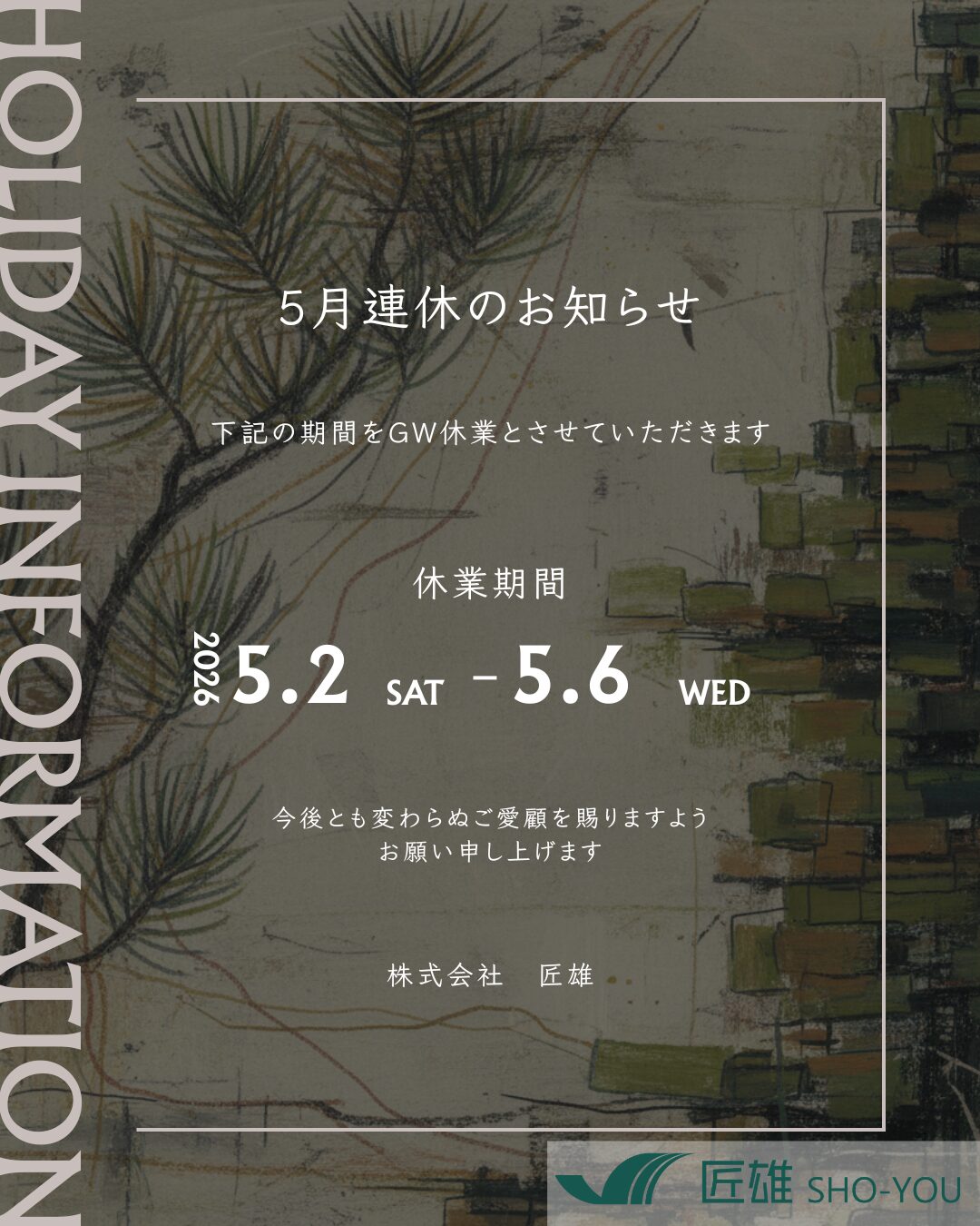 2026.05.02(sat)~2026.05.06(wed)の期間はGW休業となります。